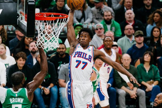 烂了一个赛季,结果抽到了探花签,就选了VJ·埃奇库姆。没想到,埃奇库姆又爆发了!都说烂队的老大刷数据,新秀早当家,这埃奇库姆职业生涯第一场常规赛,还没来得及学习经验,就要把球队扛在肩上了。比赛一开始,埃奇库姆手感就异常滚烫,迅速拿到了20分。反观‘原球队老大’、‘昔日MVP得主’、‘喀麦隆和美国以及法国三国籍球星’的恩比德,相当低迷,熟悉的招牌中距离之后,全场再无运动战进球。恩比德隐身,埃奇库姆的光芒却掩盖不住了。靠着爆发力连续杀进波士顿禁区,打得北岸花园十分寂静。各种进攻手段,这完全不像是新秀啊!